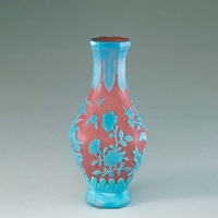 豇豆红套蓝料玻璃花蝶纹瓶(清乾…